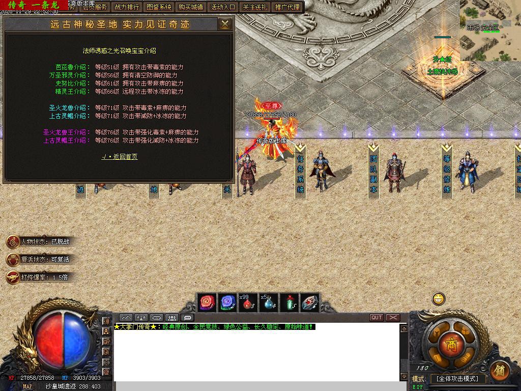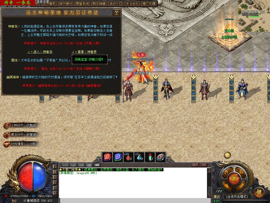 九大神兽、七大暗之系列每隔90分钟刷新一次 神兽岛每隔70分钟刷新一次(法师召唤宝宝的地方)