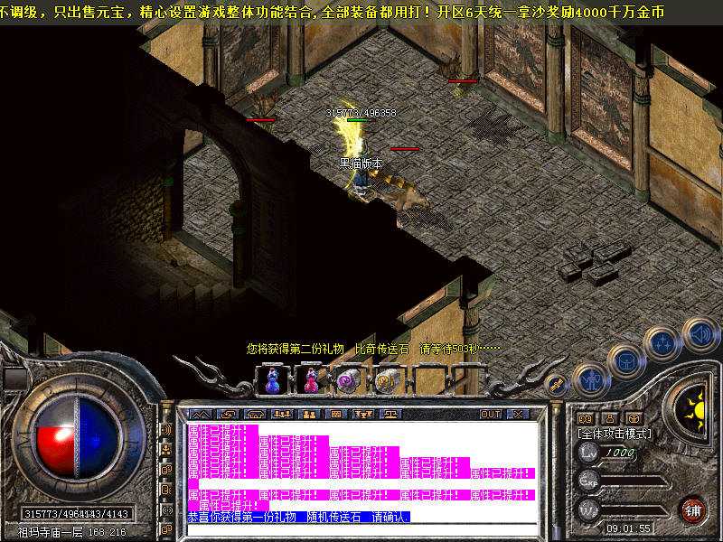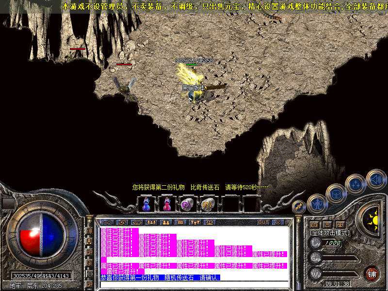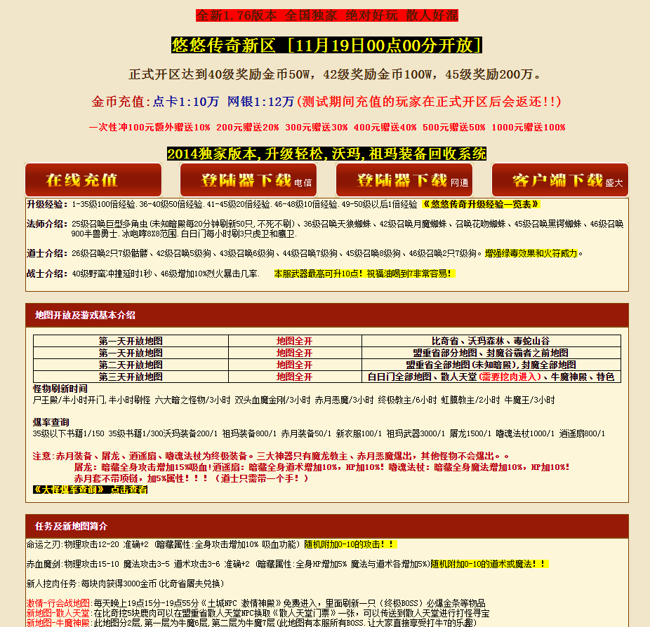 新地图-特色地图:此地图分2层,第一层为祖玛五层地图,第二层为沃玛三层地图(此地图有本服所有BOSS以及每6小时刷新一次的终极的教主).